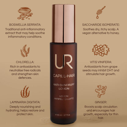 Our Anti-Dandruff Lotion contains powerful anti-microbial and anti-inflammatory plant extracts that relieve scalp irritation, reduce flaking, and prevent further build-up of dead skin cells. Ingredients like Boswellia Serrata and ginger extract work together to soothe and clear the scalp.