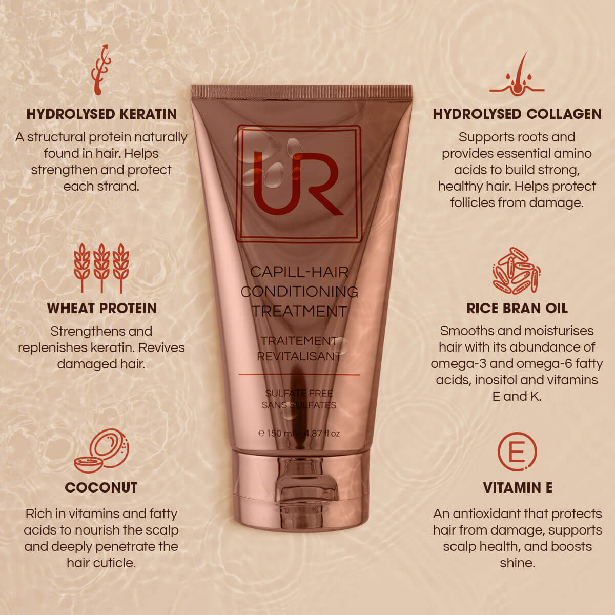 - HYDROLYSED COLLAGEN. A protein that strengthens hair and improves its elasticity, helping to prevent breakage and enhance overall hair structure.