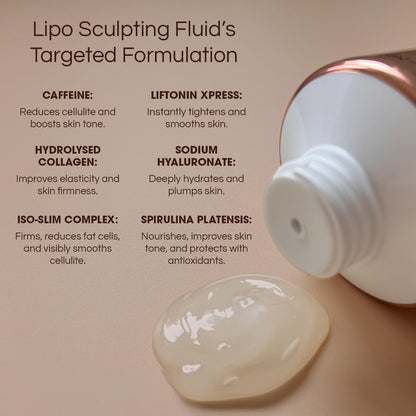 Lipo Sculpting Fluid è privo di parabeni e di altri prodotti chimici aggressivi, e include estratti benefici come il tè verde e la spirulina, noti per le loro proprietà amiche della pelle.